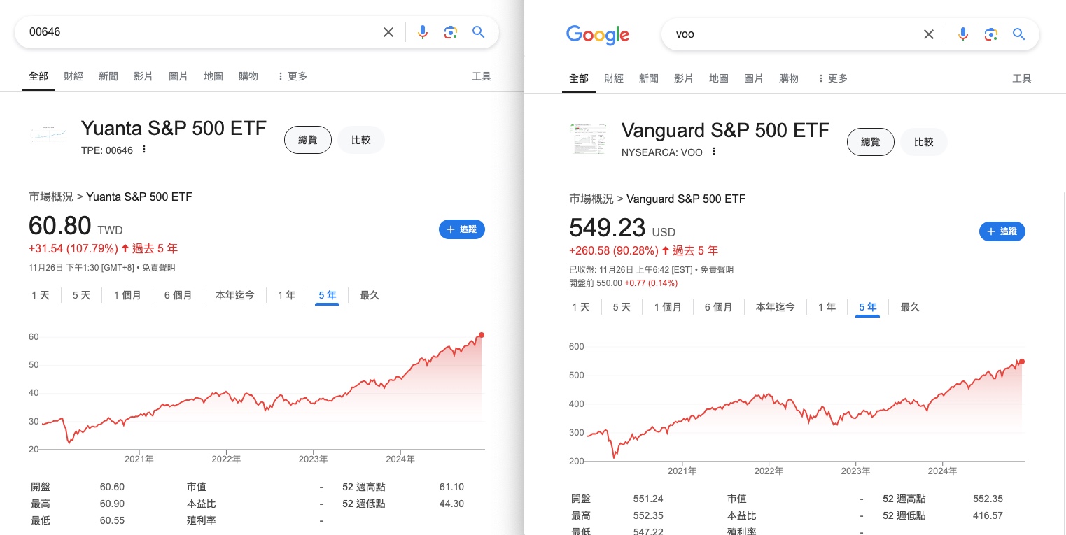 投資台灣EFT跟直接買美股會差很多嗎?台股我比較不是這麼了解,但00646看起來沒有配息,不太清楚是否為累積型,不過我隨意回抓個5年,似乎都還有不錯的成績。
