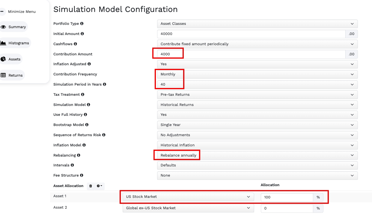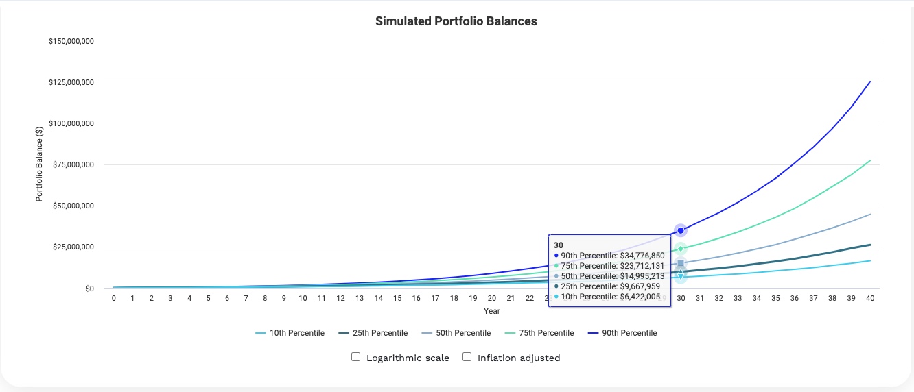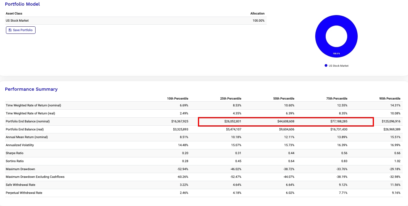 40年後我們有很大的機率資產會在2400萬到7700萬 台幣。我們抓悲觀+好一點,大概在2500萬左右。