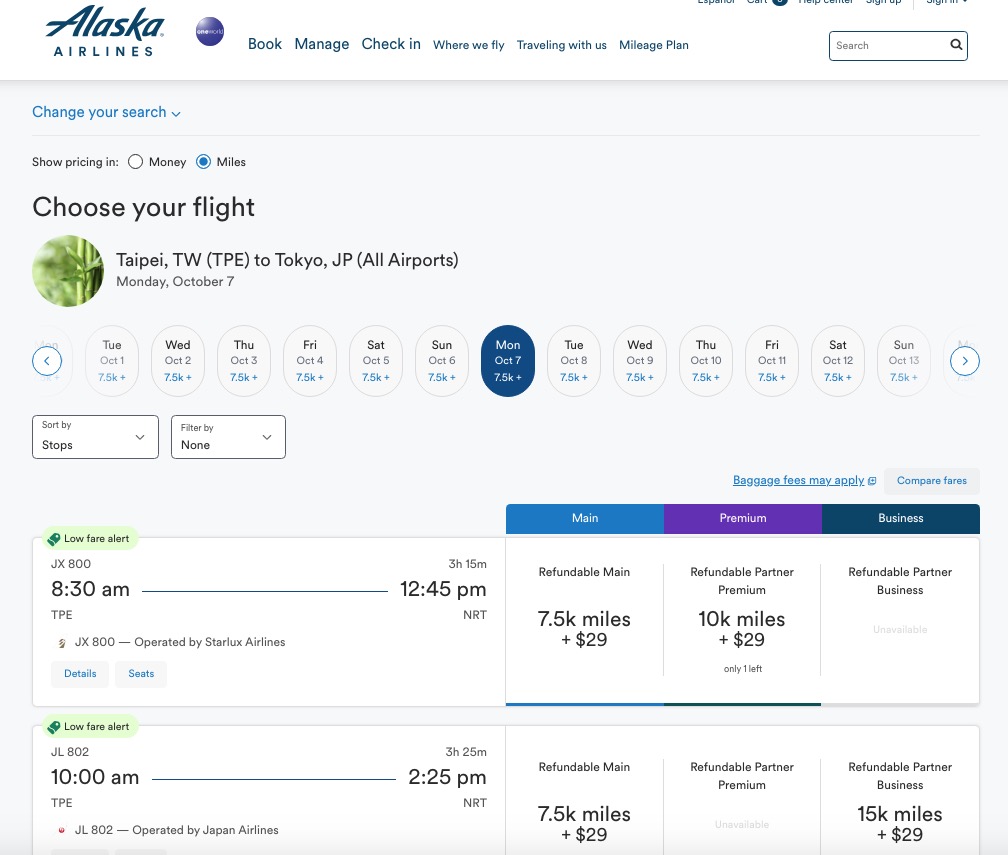 阿拉斯加航空根日本航空是夥伴關係,你可以購買阿拉斯加航空里程兌換日本航空及星宇航空的班機,如果不知道如何購買,可以到google上面搜尋『阿拉斯加里程購買』記得要看看有沒有特價再買喔(或是你可接受的價格).假設一點的點數我們取得的成本在0.6,單程商務的價格約在1萬元台幣,而經濟艙的價格單程大概6000左右,來回則X2。以上提供大家參考摟