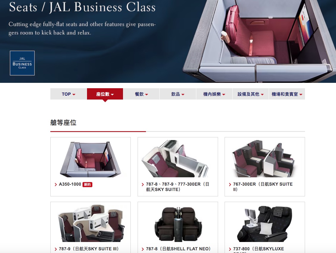 下面是目前日本航空的六種艙型,不管哪一種艙型,平躺下來都算舒服,不過舊式的隱私比較沒有這麼好,但餐食上沒有任何差異、一樣有該有的水準。