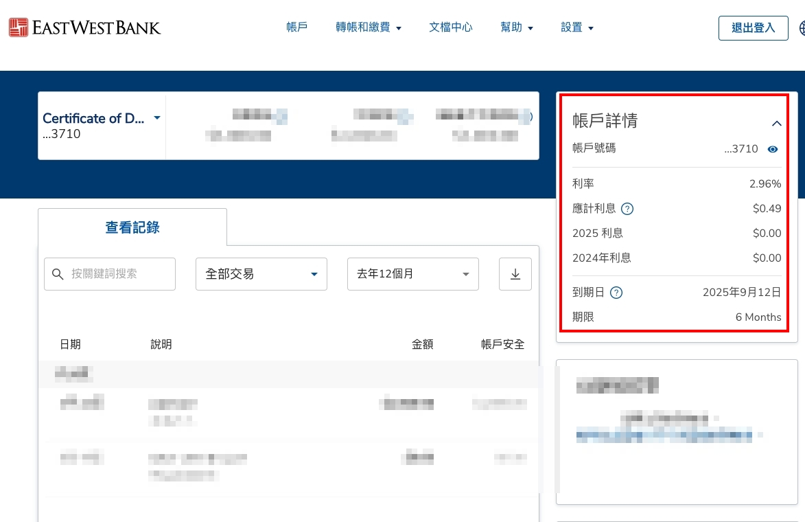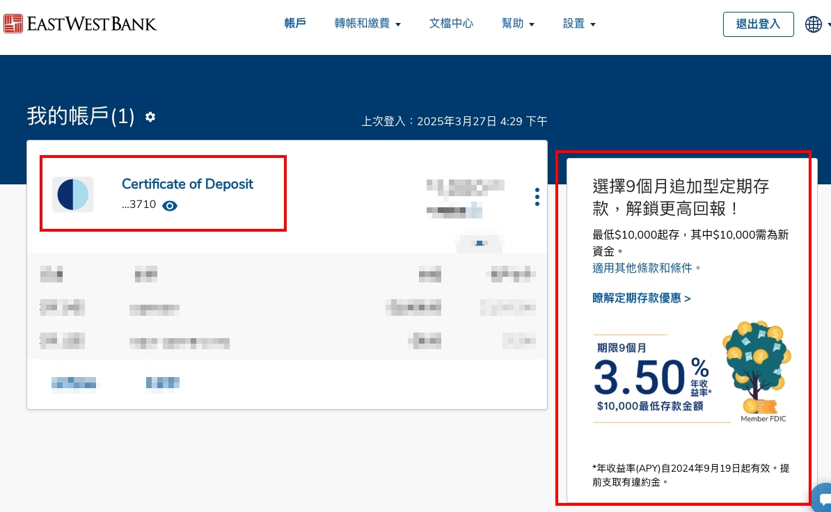 另外一個儲蓄帳戶(Saving Account)我使用的是華美銀行(開戶方式文末會說明),原因是因為儲蓄帳戶,在裡面的錢自動有接近3%的定存,如果存9個月則像下面一樣有3.5%(但這個需要另外開他的Checking Account我是覺得沒有必要)