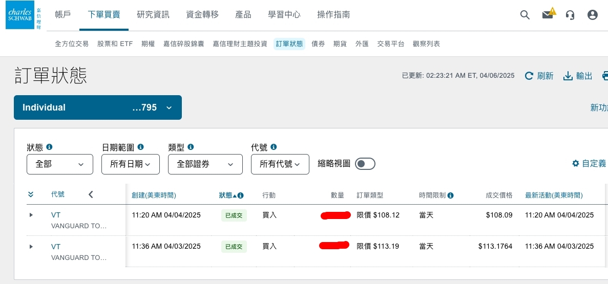 有共同支出 例如國外旅行、購物,可用提款卡全球提當地貨幣免手續費+也能直接綁美卡繳卡費、大則買車買房...等。寫文時間2025.4.7,下跌幅度大於10%通常我會 賣出一部分的債卷、而買進VT、以上供參考