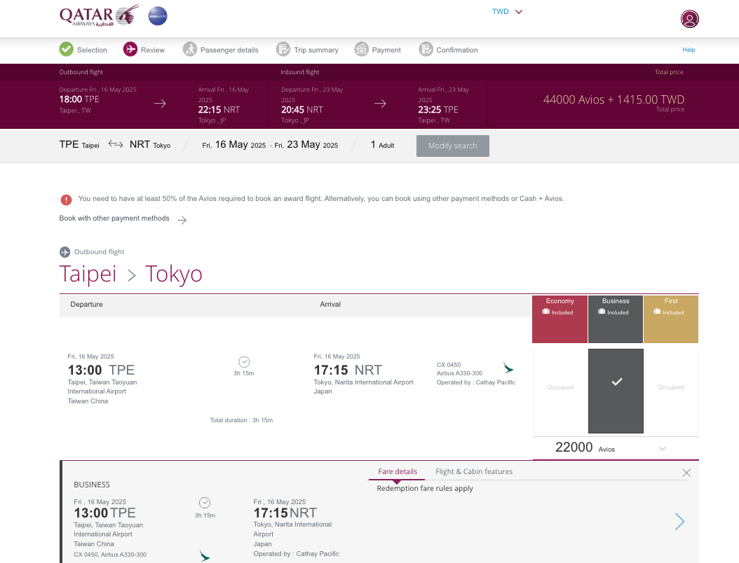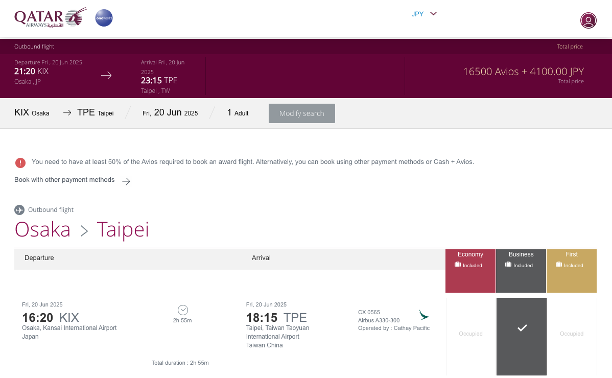 當然,你要知道 英國航空、卡達航空、芬蘭航空的點數都是通用的,所以他們可以互轉,因為兌換表格不同的關係,大阪單程商務艙只需要16500 Avios+4100日本 大約單程商務8000內搞定