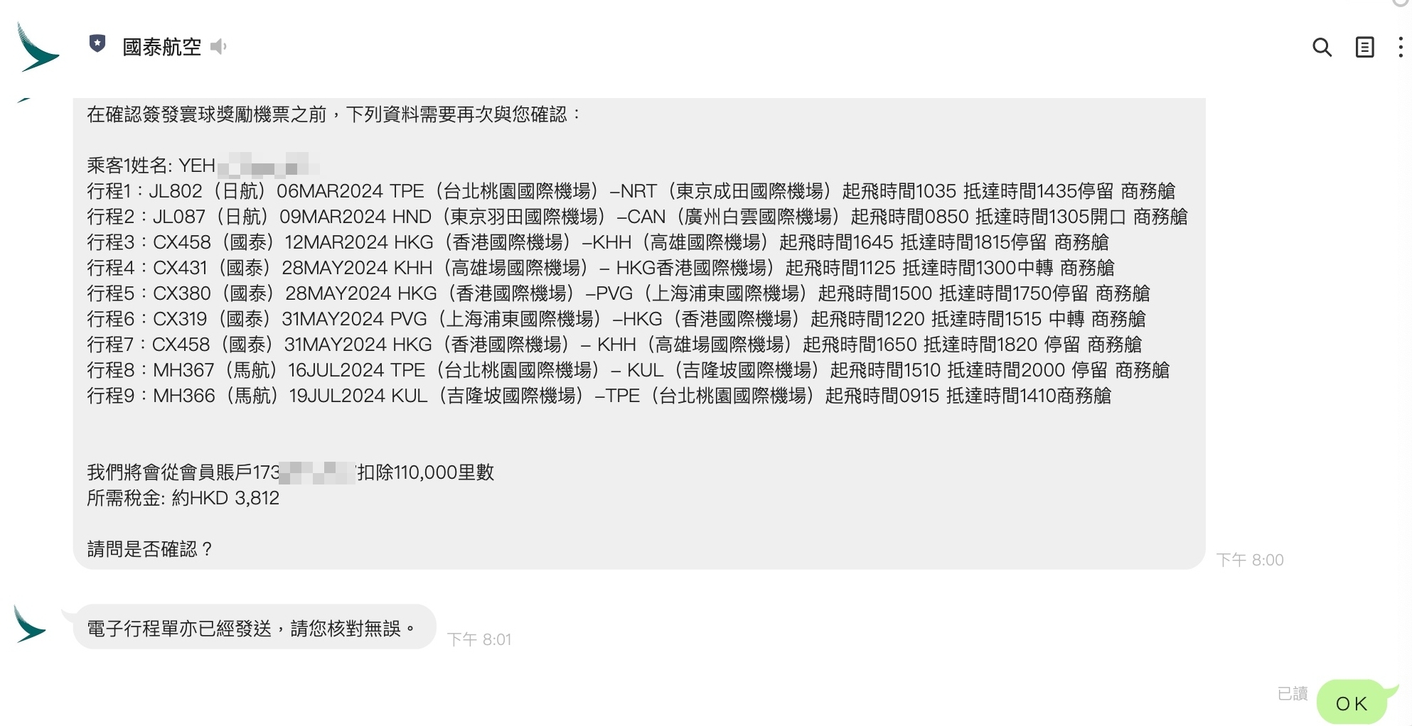警語:市面上臉書里程社團別亂看,因為有超過70%的機票是開不出來的,要麻那個航段不會放票、不然就是開口、中停或夥伴航班算錯,真的票開的出來才算實力。共計花費:11萬哩程+台幣約1.5萬稅金,網路傳大家趕快逃,11萬哩程折合現金(1哩約0.3多元)不到4萬台幣再加1.5萬台幣稅金,共計5萬5千元。好吧、漲價給他漲20%。算下來 6萬多 可以搭乘飛半個地球的商務艙 還是很划算。