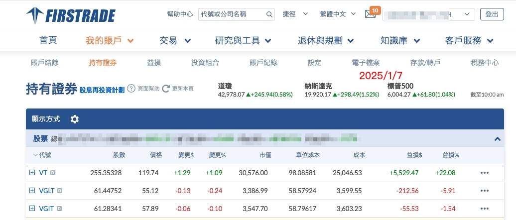 目前2025/1/7 再平衡後 帳上資金為VT 30576 /VGLT 3387 /VGIT 3548合計 37511 (如下圖)