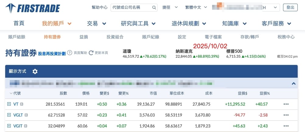 目前2025/10/ 02 帳上資金為VT 39136 /VGLT 3576/VGIT 1924 合計 44636