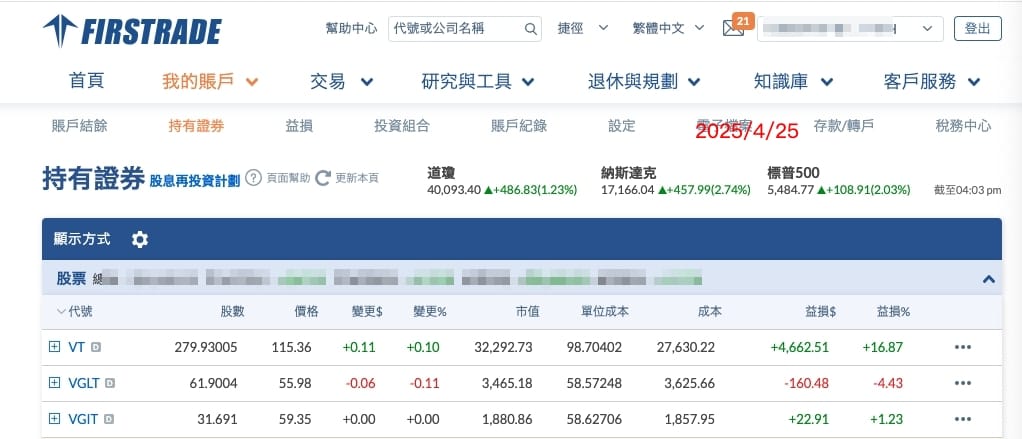 目前2025/4/25 (因為再過幾天就要赴美參加巴菲特股東會、所以提早更新本部落格) 帳上資金為VT 32292 /VGLT 3465/VGIT 1889合計 37646