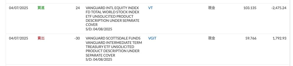 上個月2025/4/3 帳上資金為VT 29176 /VGLT 3568/VGIT 3670合計 36414