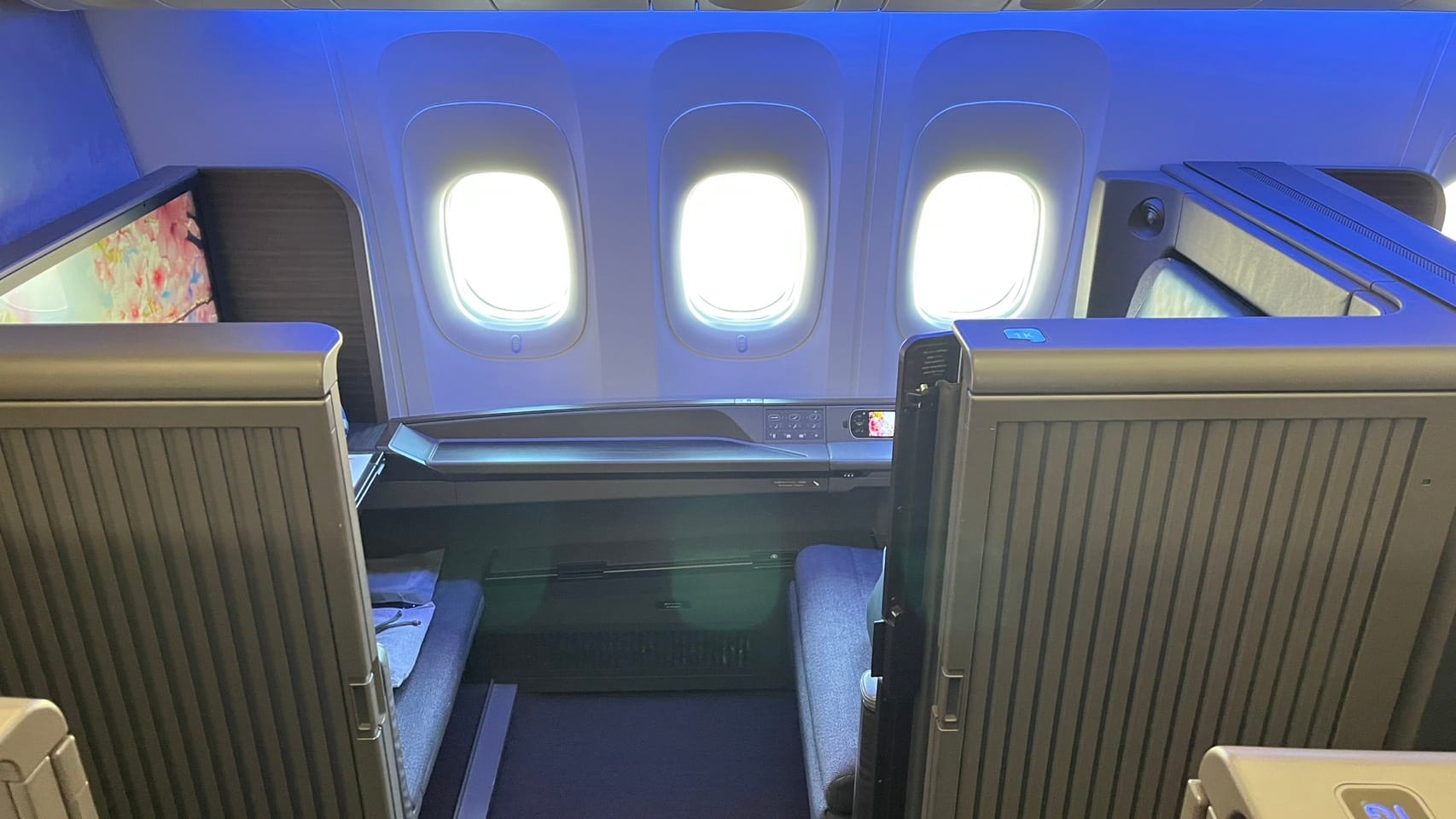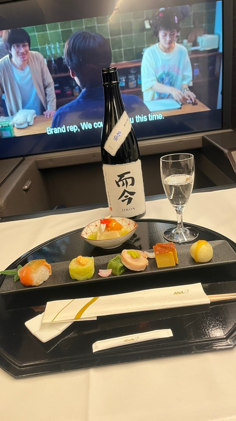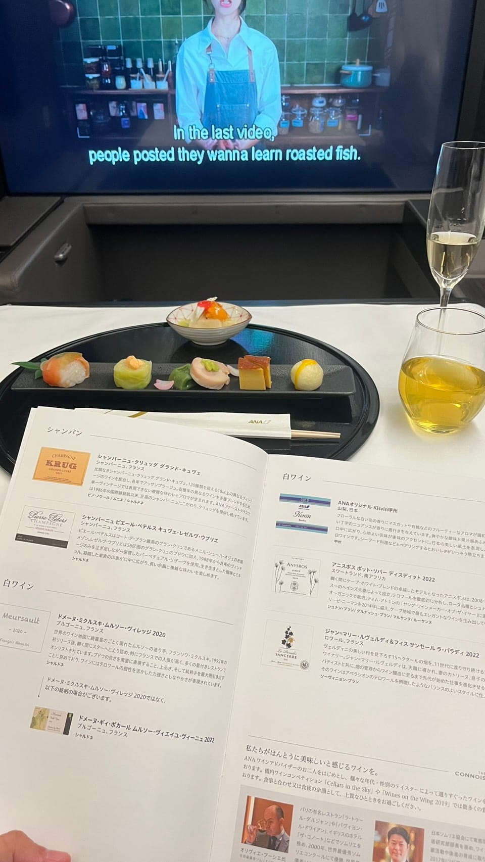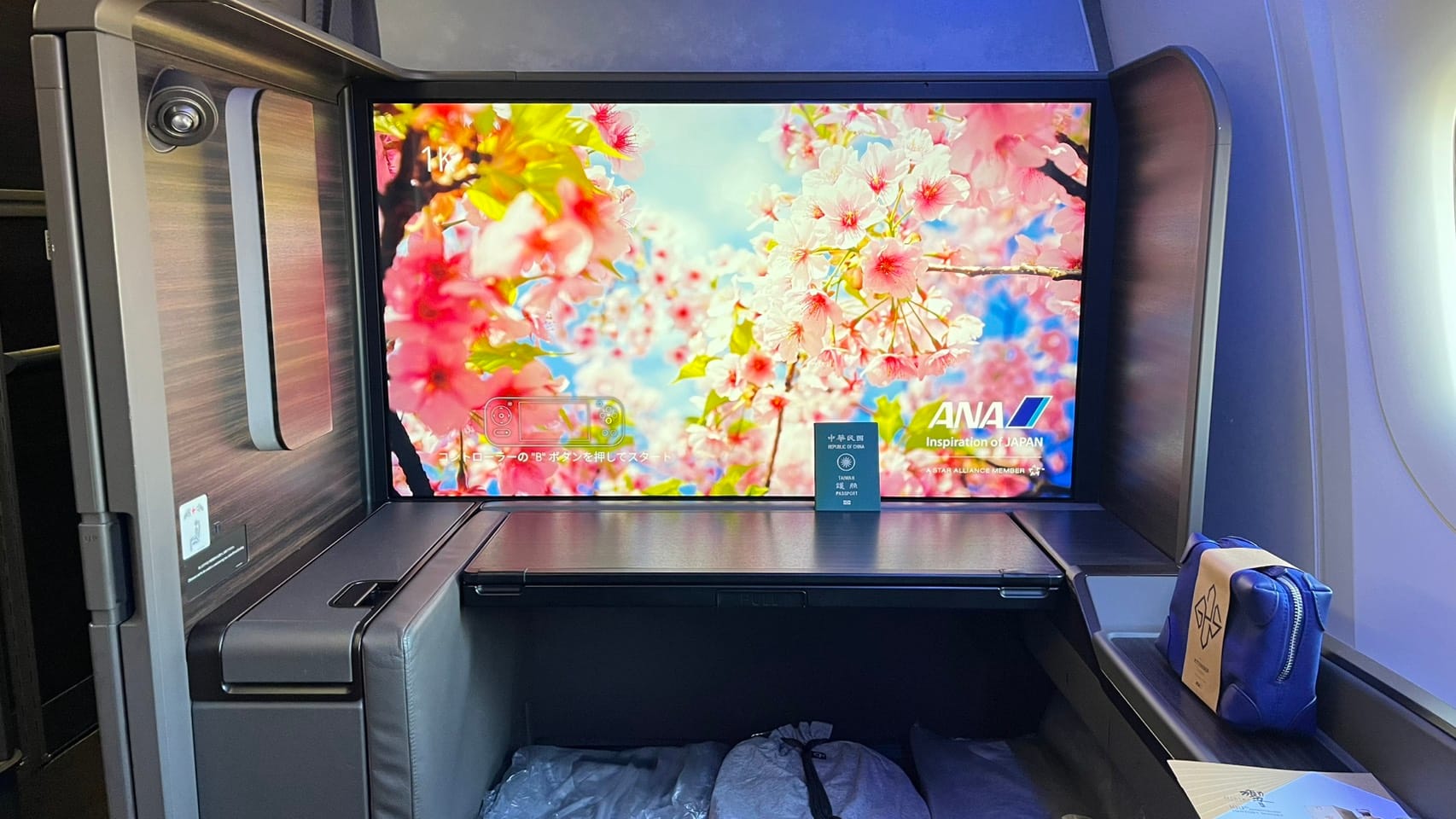 登機後這個電視的螢幕真的大到驚人 圖片第一張是護照跟電視的比例。座位選擇1K。(因台日航線無星盟頭等航班、故由長榮商務執飛)。