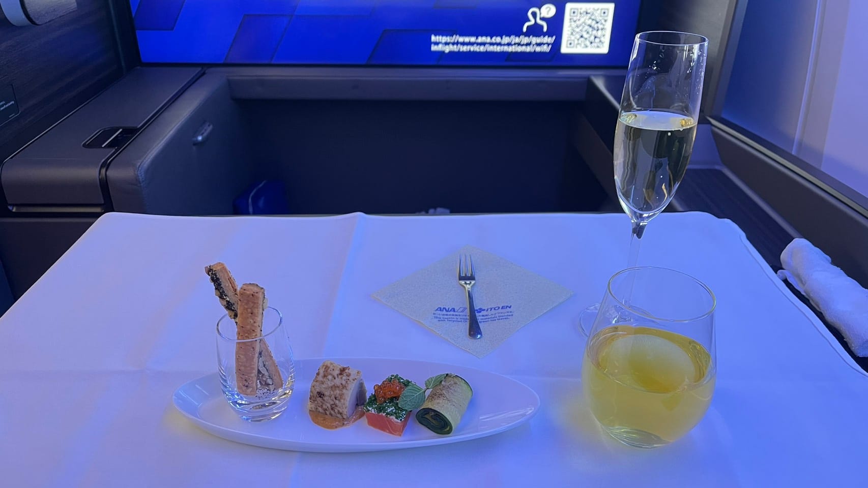 長榮商務已有很多前輩分享,我這邊就不佔版面了上機迎賓飲料為KRUG香檳+小食。主餐我選擇日食,很少第吃飯吃這麼痛苦,上菜上到『先付』時我就有點吃不下了,所以每吃一點就站起來走個1-2圈,因為貴賓室有先吃了,照片我放在最後,飛機上有免費無線網路還送質感過夜包。
