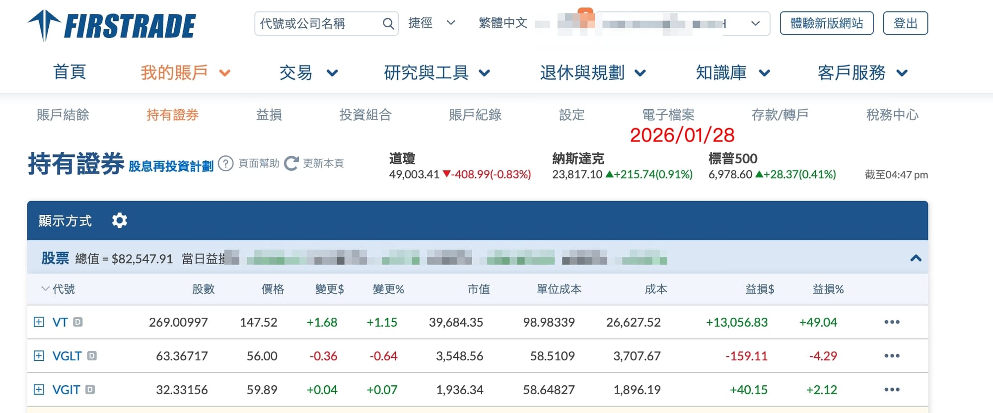 目前2026/1/ 28 帳上資金為VT 39684 /VGLT 3548/VGIT 1936 合計 45168