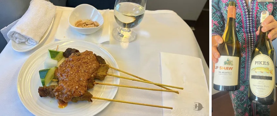 我吃了一盤後,我跟空服員說把餐車上的沙爹全部都給我,結果他笑了出來,把餐車推回後又跑過來問我說真的嗎?然後又上了一盤給我。
