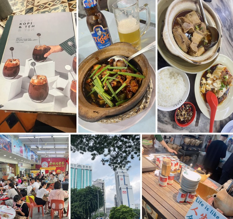 不免吃了一堆好吃的 右邊圖片是 這間咖啡店 Luckbros Kopi — Petaling Street 五杯咖啡20馬幣,代表當地的五個城市,我覺得全部都太甜。接下來吃新峰肉骨茶上面那個有啤酒的是晚上去亞羅街市集吃炒青蛙