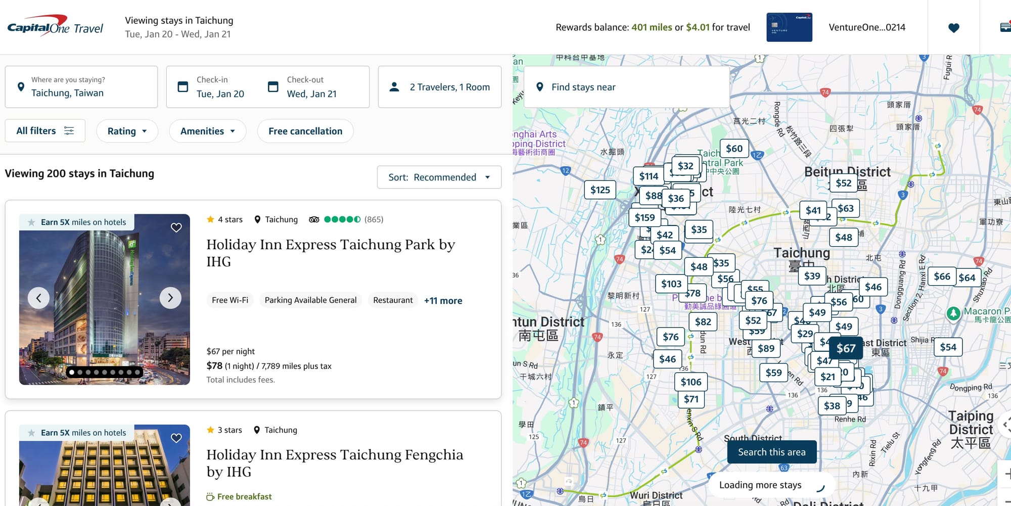 假設我要去台中出差,我直接在這裡訂飯店,大概跟我在訂房網預訂的差不多費用、但可得到更多里程數(圖片數字單位是一個晚上的美金)
