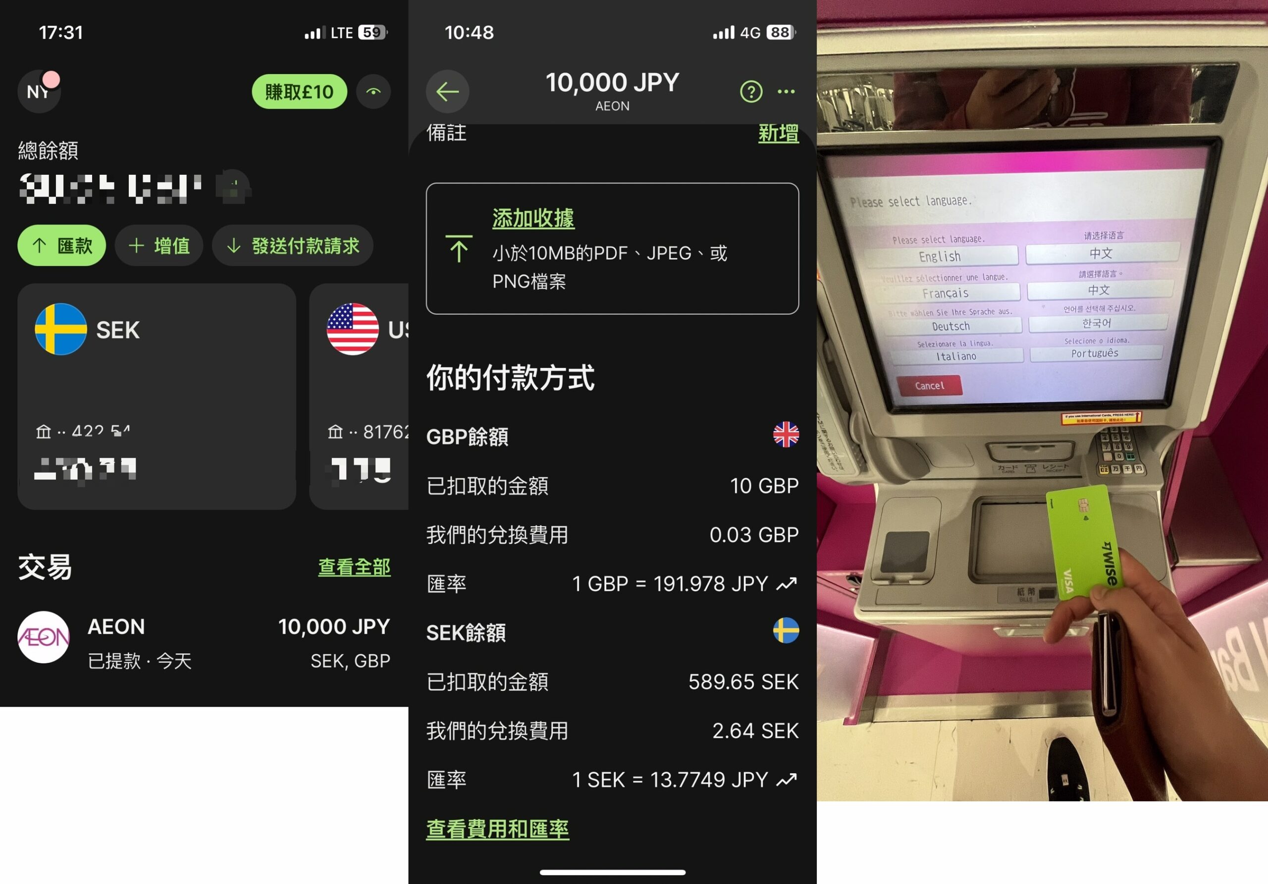 我們來看看整個手續費跟匯率,簡單來說我的wise有非常多的錢包,每個幣種都有錢,但我不知道他是如何扣款,這次是英鎊扣10元、SEK扣500多。我大概算起來 領取2000初頭的現金大約是台幣10元不到。這邊實測給大家參考至於對這張卡有興趣的 可以看下面註冊連結辦理